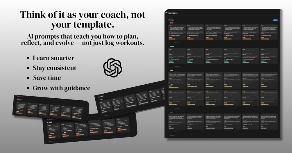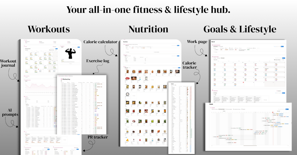You'll get a complete Notion fitness system that will help you track your progress, become more consistent and help you leverage artificial intelligence.