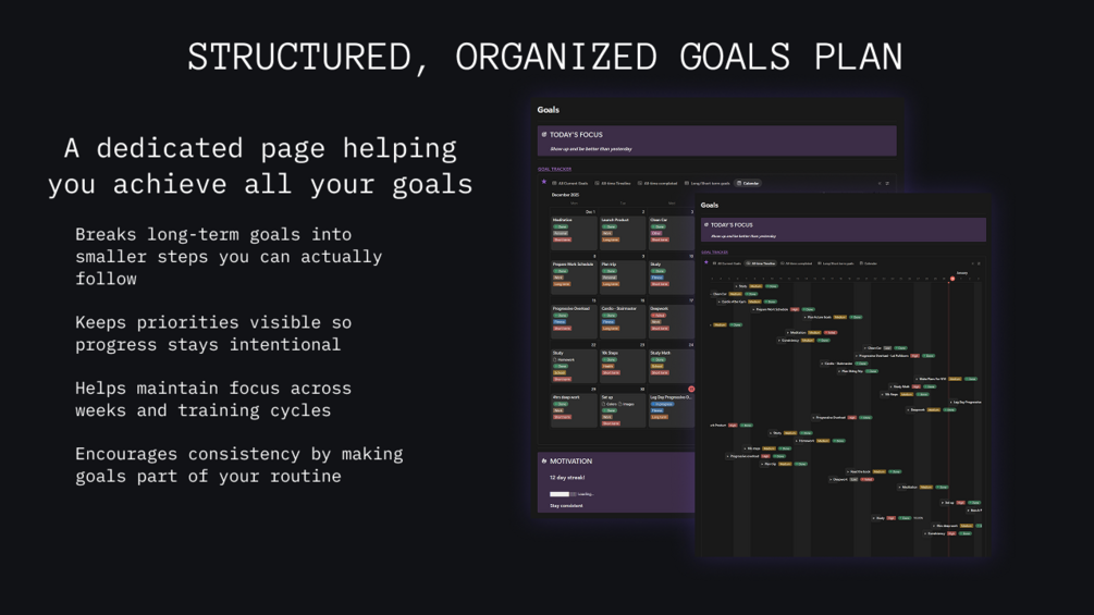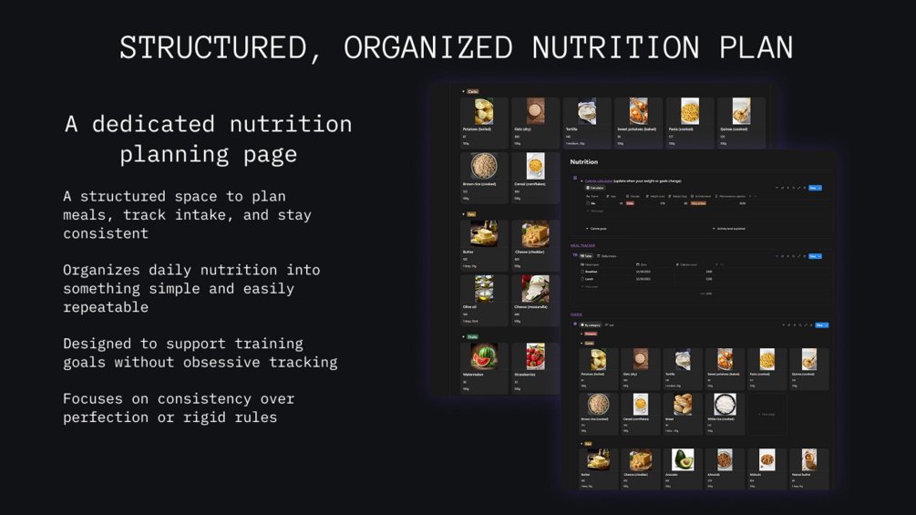 You'll get a clean, structured, notion based workout tracker. Based on the FitOS complete notion fitness system it includes tools for planning, reviewing and tracking workouts, optimizing recovery patterns and refining your diet. It's the perfect tool for anyone trying to perfect their fitness programme and ensure visible progress.